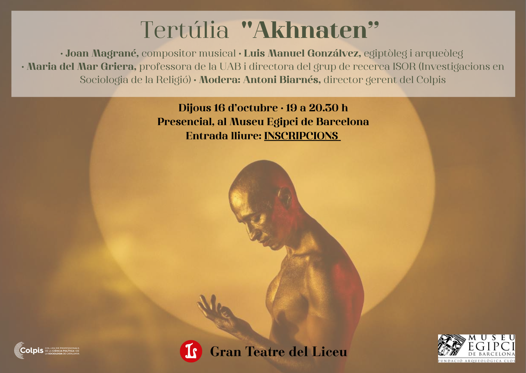 El Gran Teatre del Liceu programa l’òpera Akhnaten des del 16 d’octubre al 3 de novembre. En el marc d’aquesta òpera, el Liceu, el Museu Egipci de Barcelona i el COLPIS organitzem una tertúlia a tres bandes amb experts de l’àmbit de la música, l’arqueologia i la sociologia per donar a conèixer la figura d’Akhenaton; un faraó que va desafiar els fonaments polítics, les creences religioses i les pràctiques artístiques de la seva època.